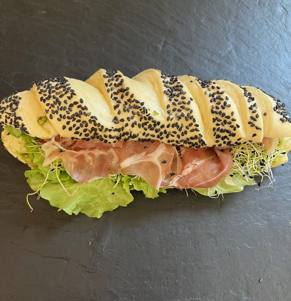 Composé d’un pain Bao (pain cuit à la vapeur), jambon cru d’Italie, Roquette fraiche, graines germées, sauce pesto, tomates cerises confites, copeaux de parmesan et pignons de pin torréfiés.